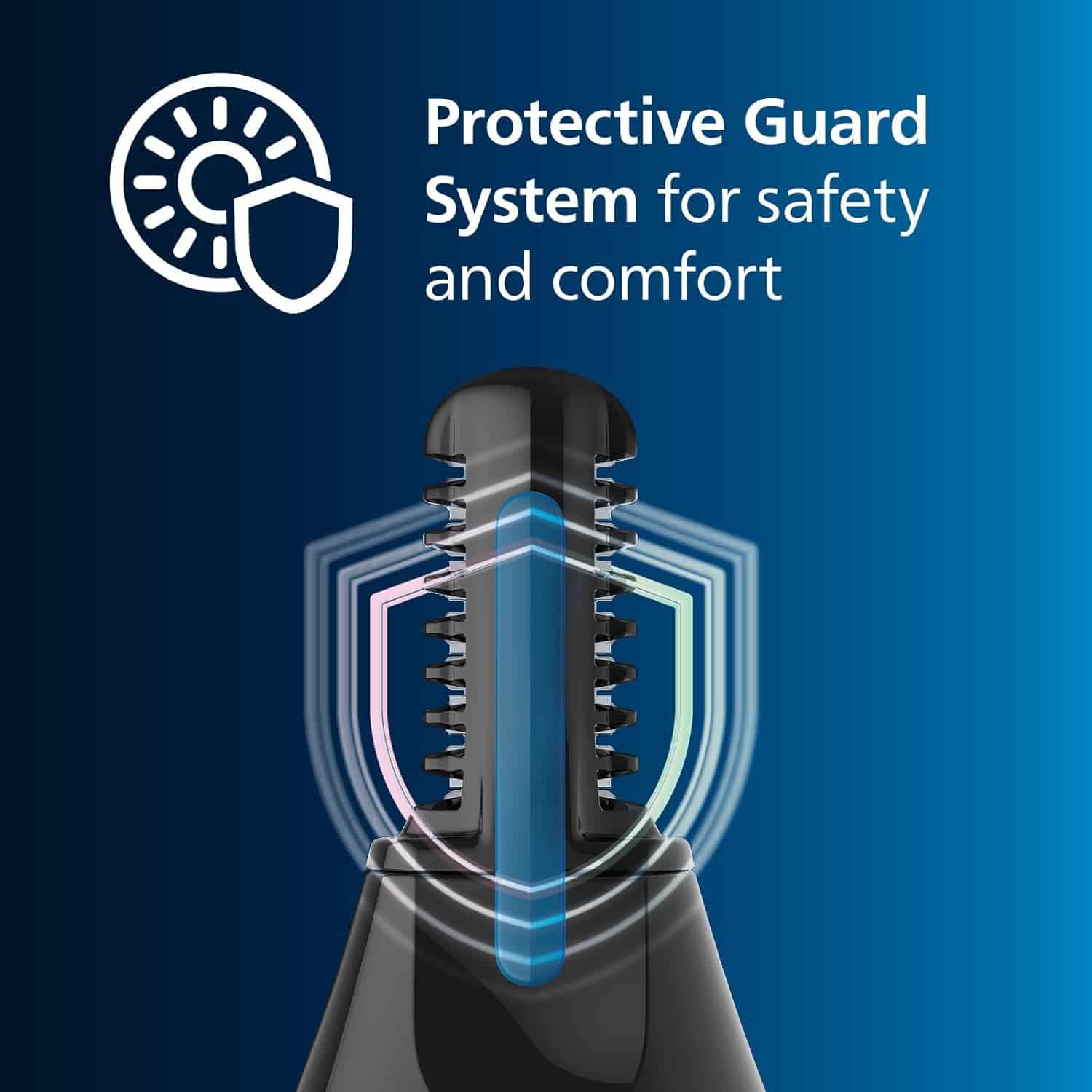 یک ماشین اصلاح بینی، گوش و ابرو که برای ایمنی و راحتی طراحی شده است، سیستم محافظ محافظ تیغه ها را می پوشاند تا از تماس مستقیم با پوست اطمینان حاصل کند.