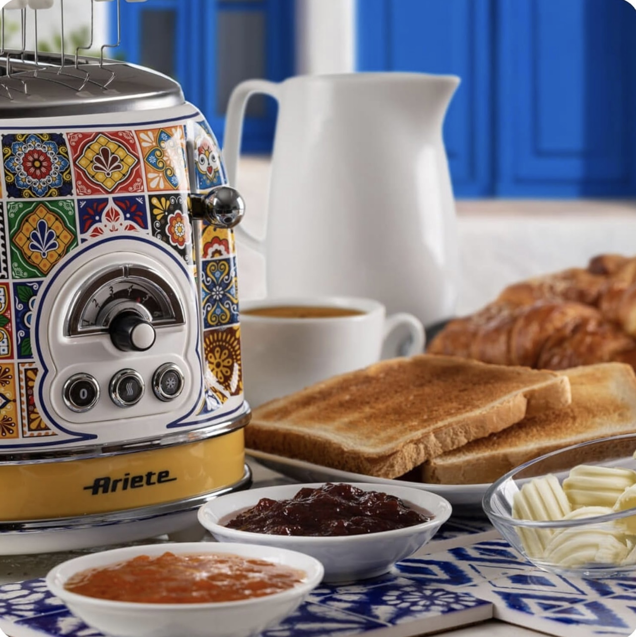 توستر نان آریته مدل Positano 155 با الهام از کاشیکاریهای سنتی مدیترانهای و رنگ سفید، انتخابی متفاوت برای کسانی است که علاوه بر کارایی، زیبایی شگفت انگیز نیز برایشان اهمیت ویژه ای دارد. این دستگاه با ۲ اسلات برای برشتهسازی همزمان دو برش نان، تنظیم درجهو میزان برشتگی، دکمه اتومات فروزن فریز ،استاپ سریع و سینی جمعآوری خرده نان طراحی گردیده.