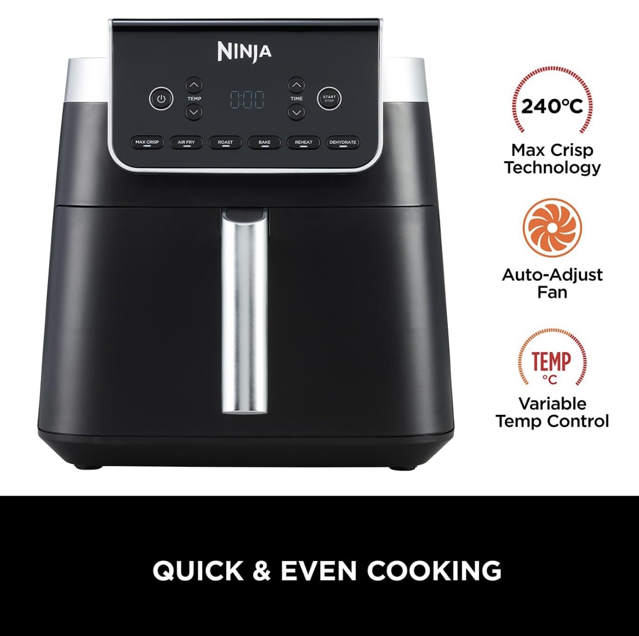 6 برنامه پخت پیش‌فرض: شامل سرخ کردن با هوا (Air Fry)، حداکثر ترد کردن (Max Crisp)، بریان کردن (Roast)، پخت (Bake)، گرم کردن مجدد (Reheat) و خشک کردن (Dehydrate).